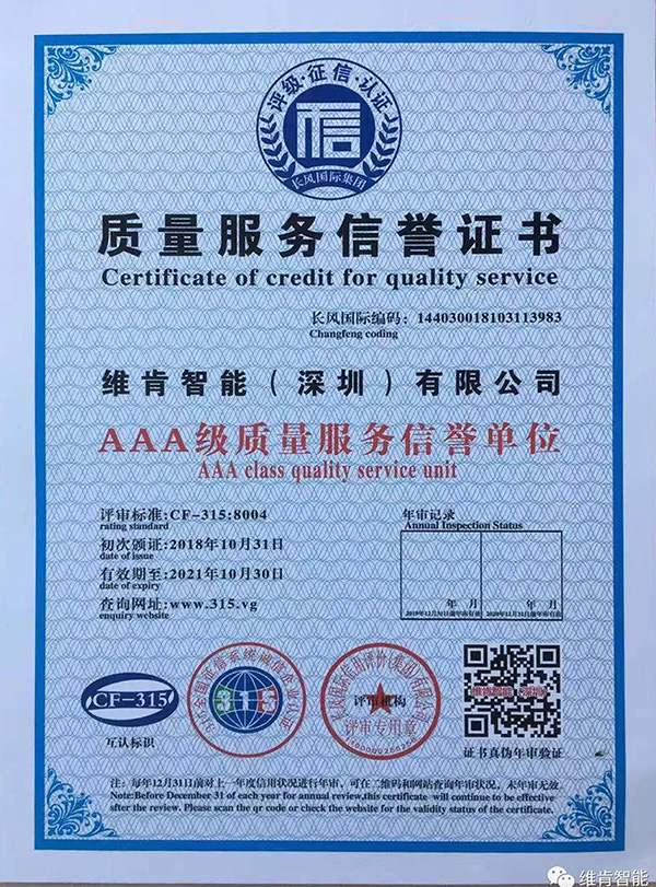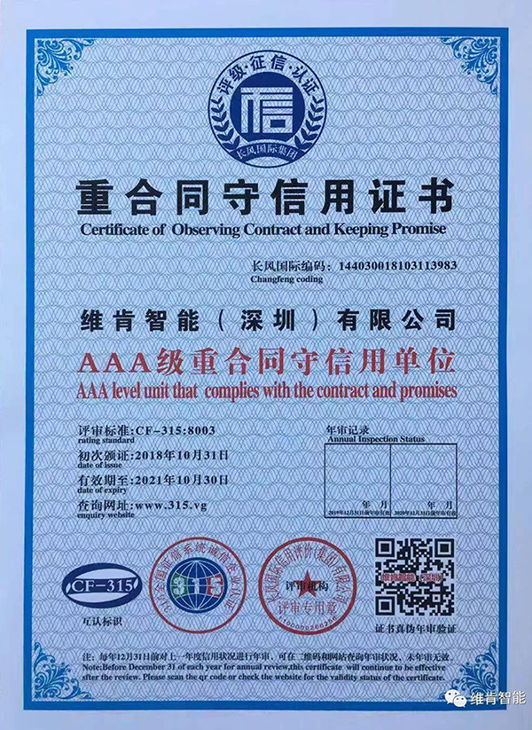 VICON(维肯智能)自成立以来,始终坚持诚信经营,在行业内树立了良好的口碑。近日荣获由获得“重合同守信用”和”AAA级质量服务信誉单位“”称号是对VICON的认可和鼓励。